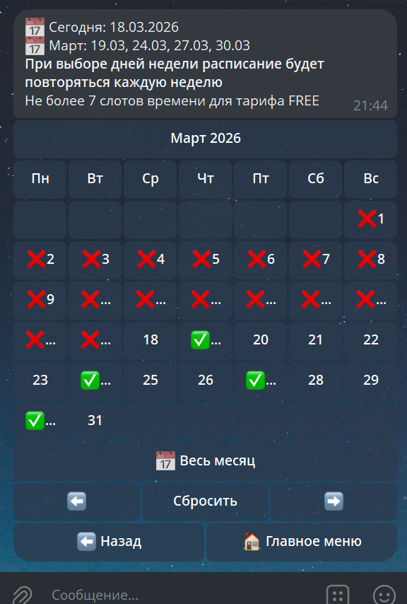 💡 Важно: Эти режимы работают взаимоисключающе. Если вы выбрали точные даты, но затем нажали на любой «День недели», все конкретные даты автоматически сбросятся. Это сделано для быстрого перехода в режим цикличных публикаций без необходимости вручную снимать десятки галочек с календаря.