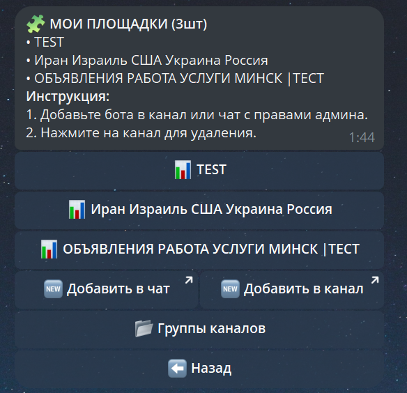 Просто нажмите кнопку [🆕 Добавить в чат] или [🆕 Добавить в канал]. Умная система Телеграма сама предложит выбрать нужный ресурс из вашего списка и выдать боту права администратора (они нужны исключительно для публикации и удаления постов). Площадка моментально появится в вашем списке. ⚙️ Управление списками: Все добавленные вами площадки уютно располагаются на этом экране. Если вы хотите удалить канал из базы бота — просто нажмите на его название.