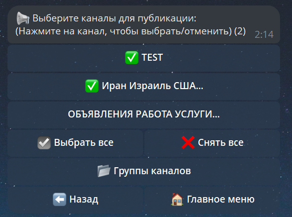 Выбор каналов для публикации — мультивыбор и группы каналов
