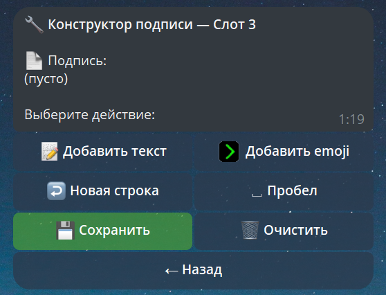 📝 Добавить текст — введите и отправьте боту кусок текста (поддерживаются ссылки, жирный и скрытый шрифт). ✨ Добавить emoji — откроет огромный встроенный каталог Premium-эмодзи бота. Просто выберите нужный, и он приклеится к вашей подписи! ↩️ Новая строка / ␣ Пробел — кнопки быстрого форматирования, чтобы легко отступать строки. 🗑 Очистить— удалить собранный текст и начать сборку подписи с чистого листа.