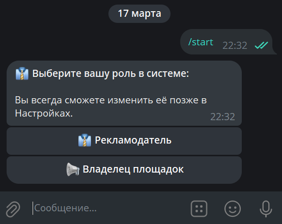 Владелец (админ) площадок — превращает бота в вашу личную панель монетизации. Здесь вы подключаете свои каналы / чаты, получаете рекламные заявки и распределяете их по календарю.