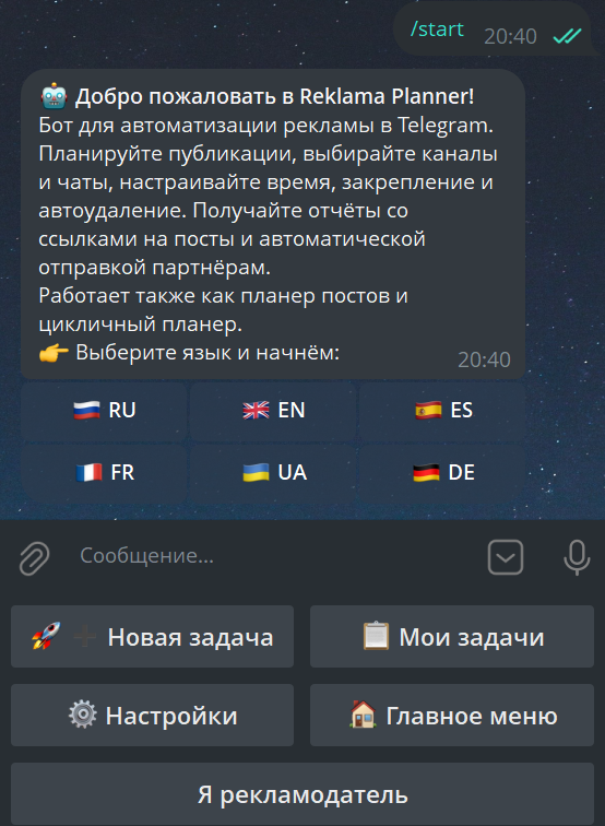 ReklamaPlan Bot — профессиональный бот-планер для Телеграм — полная автоматизация публикации постов в каналах и чатах, циклических технических публикаций(типа правил и др.). Этот бот для публикации постов в Телеграм заменяет ручную работу по размещению рекламы, сбору ссылок и отправке отчётов рекламодателям.