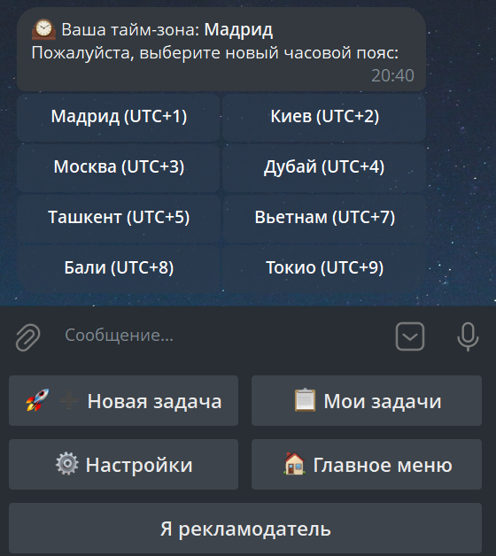 💡 Совет: Обязательно проверьте, правильно ли бот определил ваш часовой пояс (на скриншоте Europe/Madrid). Если пояс указан неверно, можете изменить его в Настройках бота в Главном меню!