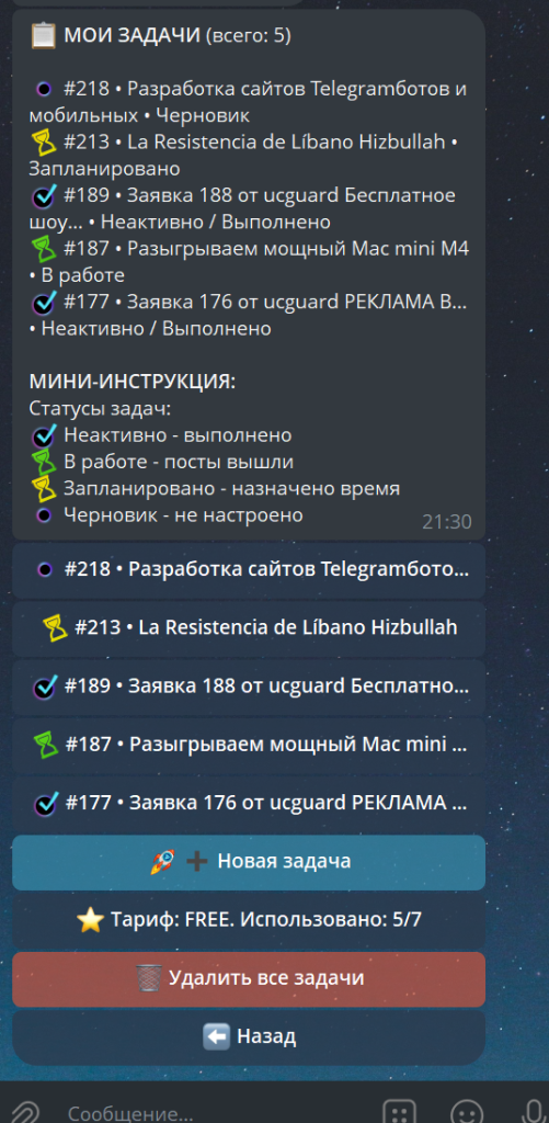 В этом разделе хранится список всех ваших текущих и прошлых публикаций. Бот помечает задачи цветными статусами для удобного контроля: