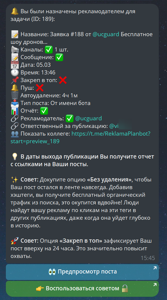 При назначении рекламодателя — он сразу получает полную карточку: каналы, даты, время, закреп, тип поста. Плюс советы по допродажам: