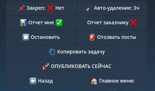 🚀 Опубликовать сейчас / ✅ Активировать задачу — последние кнопки: запуск по расписанию, либо мгновенный выстрел по всем каналам вне очереди!
