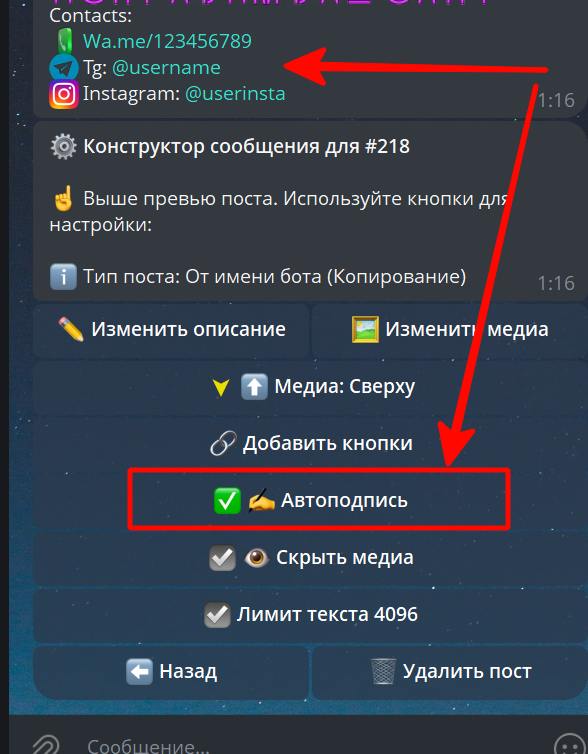 ✍️ Автоподпись — в один клик прикрепляет к посту заранее созданный вами рекламный «хвостик» (например, ваши контактные данные или призыв к действию).