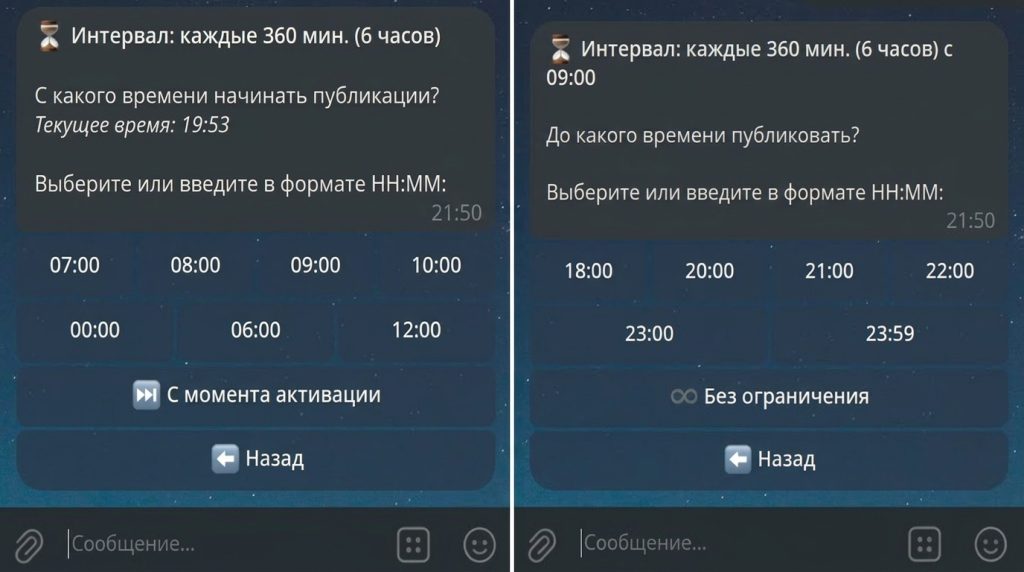 Как только вы выбрали частоту постов (например, «каждые 6 часов»), бот предложит настроить «суточное окно» — промежуток времени внутри каждого дня, когда бот имеет право выкладывать посты в канал. Состоит из двух шагов: